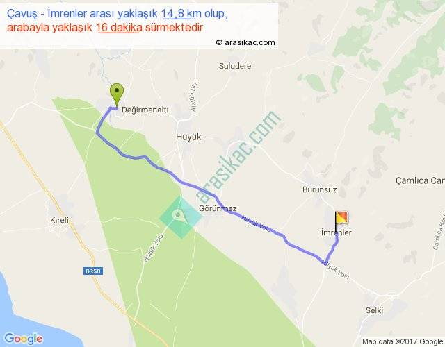 Çavuş - İmrenler arası yaklaşık olarak 90 km/h ile yukarıda belirtilen sürede olup, iki yerin kuş uçuşu uzaklığı (mesafesi) 11'dir. Yolculuk otobüsle 20 dakika sürmektedir.