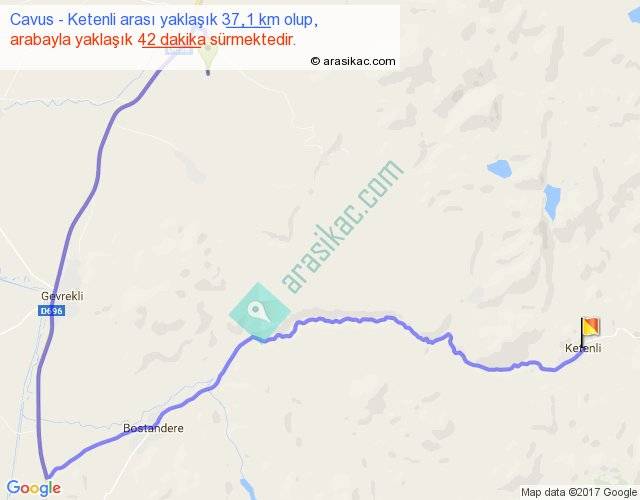 Cavus - Ketenli arası yaklaşık olarak 90 km/h ile yukarıda belirtilen sürede olup, iki yerin kuş uçuşu uzaklığı (mesafesi) 14'dir. Yolculuk otobüsle 54 dakika sürmektedir.