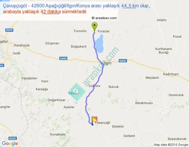 Çavuşçugöl - 42600 Aşağıçiğil Ilgın Konya arası yaklaşık olarak 90 km/h ile yukarıda belirtilen sürede olup, iki yerin kuş uçuşu uzaklığı (mesafesi) 38'dir. Yolculuk otobüsle 54 dakika sürmektedir.