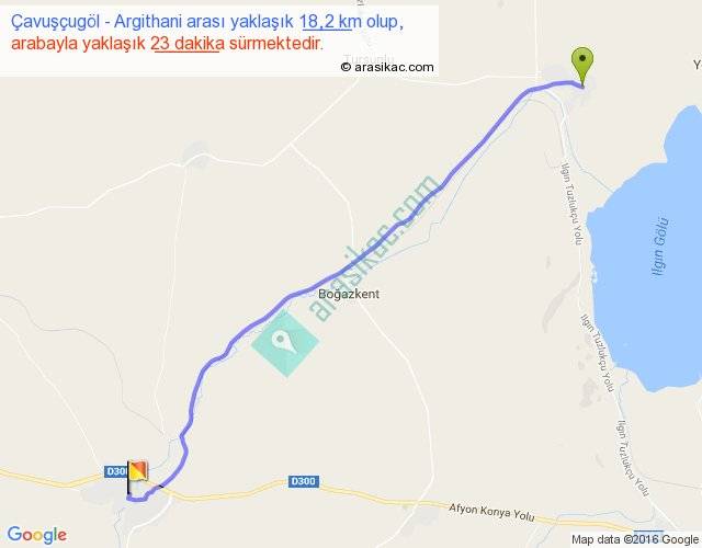 Çavuşçugöl - Argithani arası yaklaşık olarak 90 km/h ile yukarıda belirtilen sürede olup, iki yerin kuş uçuşu uzaklığı (mesafesi) 17'dir. Yolculuk otobüsle 29 dakika sürmektedir.