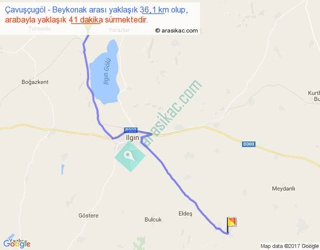 Çavuşçugöl - Beykonak arası yaklaşık olarak 90 km/h ile yukarıda belirtilen sürede olup, iki yerin kuş uçuşu uzaklığı (mesafesi) 29'dir. Yolculuk otobüsle 53 dakika sürmektedir.