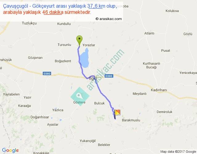 Çavuşçugöl - Gökçeyurt arası yaklaşık olarak 90 km/h ile yukarıda belirtilen sürede olup, iki yerin kuş uçuşu uzaklığı (mesafesi) 31'dir. Yolculuk otobüsle 59 dakika sürmektedir.