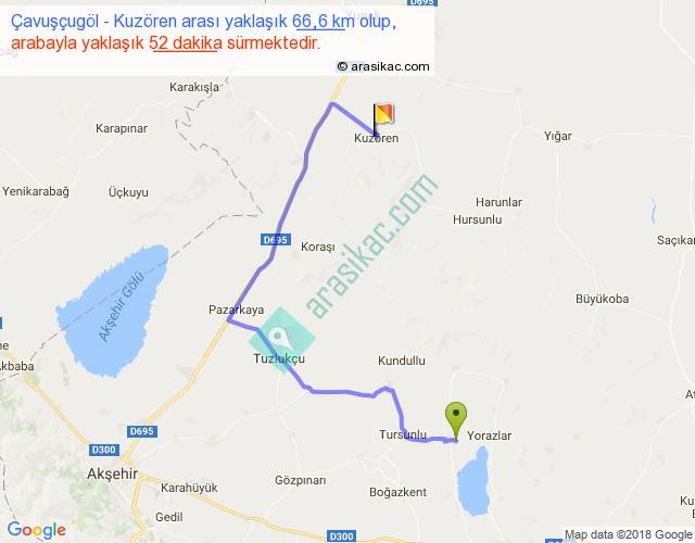 Çavuşçugöl - Kuzören arası yaklaşık olarak 90 km/h ile yukarıda belirtilen sürede olup, iki yerin kuş uçuşu uzaklığı (mesafesi) 34'dir. Yolculuk otobüsle 1 saat 7 dakika sürmektedir.
