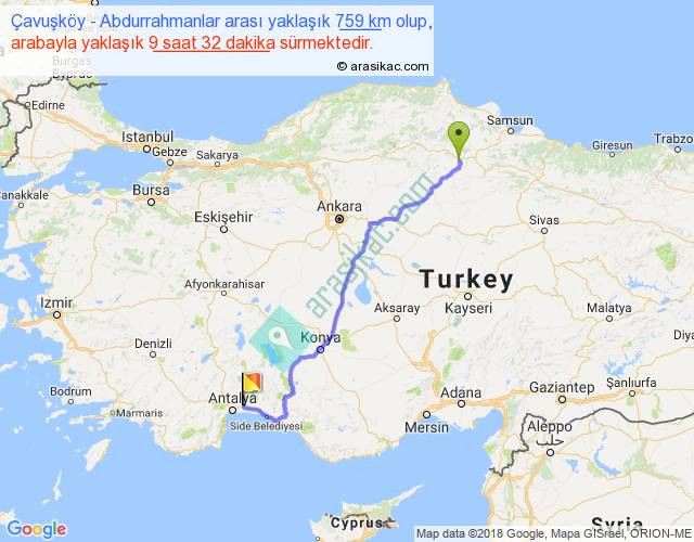 Çavuşköy - Abdurrahmanlar arası yaklaşık olarak 90 km/h ile yukarıda belirtilen sürede olup, iki yerin kuş uçuşu uzaklığı (mesafesi) 569'dir. Eğer belirtilen yerler arasında uçak seferi var ise bu süre uçakla 52 dakika'ya kadar düşebilir. Yolculuk otobüsle 12 saat 23 dakika sürmektedir.