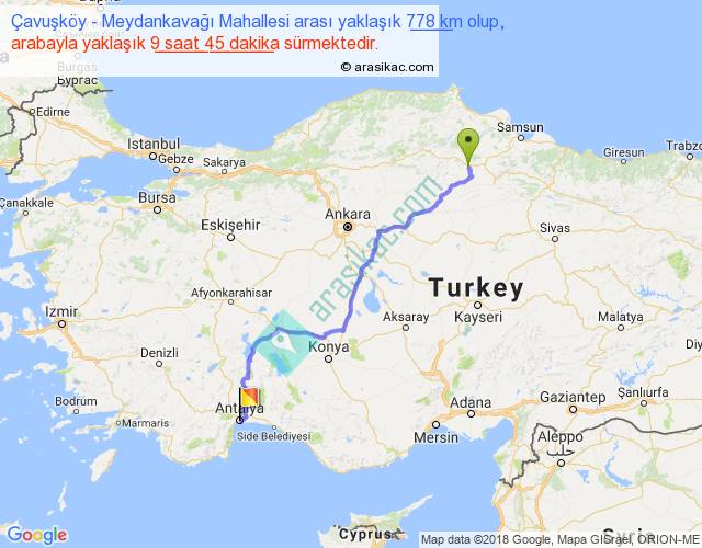 Çavuşköy - Meydankavağı Mahallesi arası yaklaşık olarak 90 km/h ile yukarıda belirtilen sürede olup, iki yerin kuş uçuşu uzaklığı (mesafesi) 587'dir. Eğer belirtilen yerler arasında uçak seferi var ise bu süre uçakla 54 dakika'ya kadar düşebilir. Yolculuk otobüsle 12 saat 40 dakika sürmektedir.