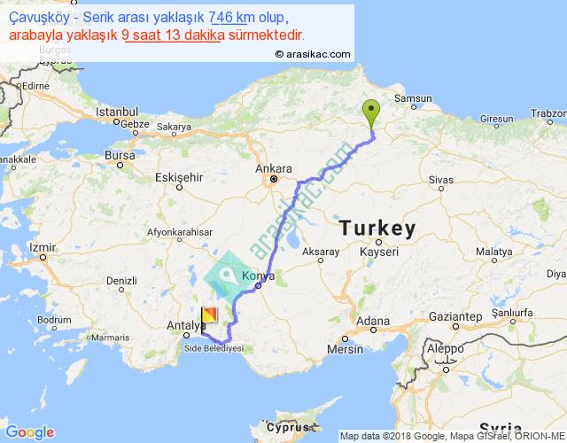Çavuşköy - Serik arası yaklaşık olarak 90 km/h ile yukarıda belirtilen sürede olup, iki yerin kuş uçuşu uzaklığı (mesafesi) 563'dir. Eğer belirtilen yerler arasında uçak seferi var ise bu süre uçakla 51 dakika'ya kadar düşebilir. Yolculuk otobüsle 11 saat 58 dakika sürmektedir.