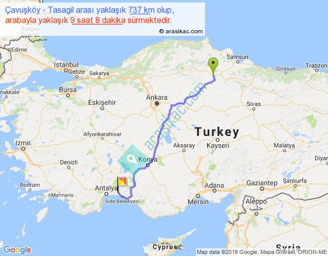 Çavuşköy - Tasagil arası yaklaşık olarak 90 km/h ile yukarıda belirtilen sürede olup, iki yerin kuş uçuşu uzaklığı (mesafesi) 556'dir. Eğer belirtilen yerler arasında uçak seferi var ise bu süre uçakla 51 dakika'ya kadar düşebilir. Yolculuk otobüsle 11 saat 52 dakika sürmektedir.