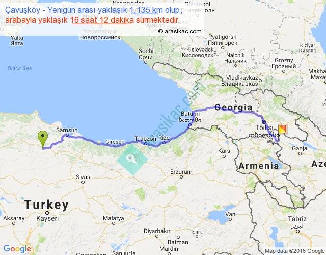 Çavuşköy - Yenigün arası yaklaşık olarak 90 km/h ile yukarıda belirtilen sürede olup, iki yerin kuş uçuşu uzaklığı (mesafesi) 849'dir. Eğer belirtilen yerler arasında uçak seferi var ise bu süre uçakla 1 saat 18 dakika'ya kadar düşebilir. Yolculuk otobüsle 21 saat 3 dakika sürmektedir.
