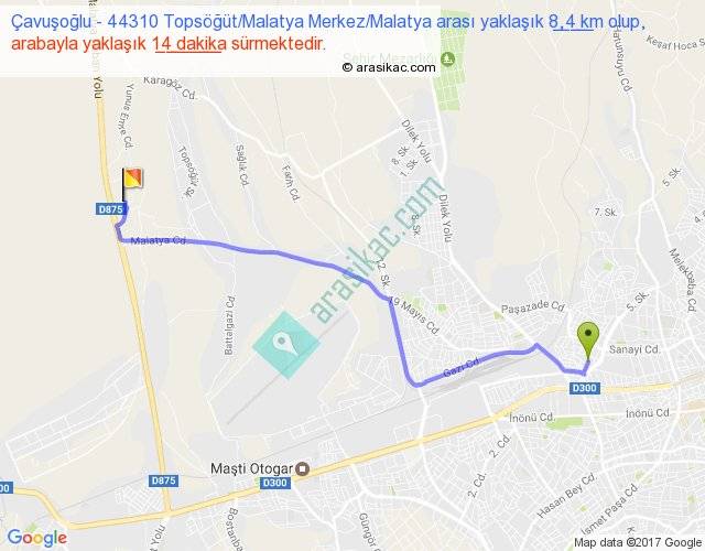 Çavuşoğlu - 44310 Topsöğüt Malatya Merkez Malatya arası yaklaşık olarak 90 km/h ile yukarıda belirtilen sürede olup, iki yerin kuş uçuşu uzaklığı (mesafesi) 7'dir. Yolculuk otobüsle 18 dakika sürmektedir.