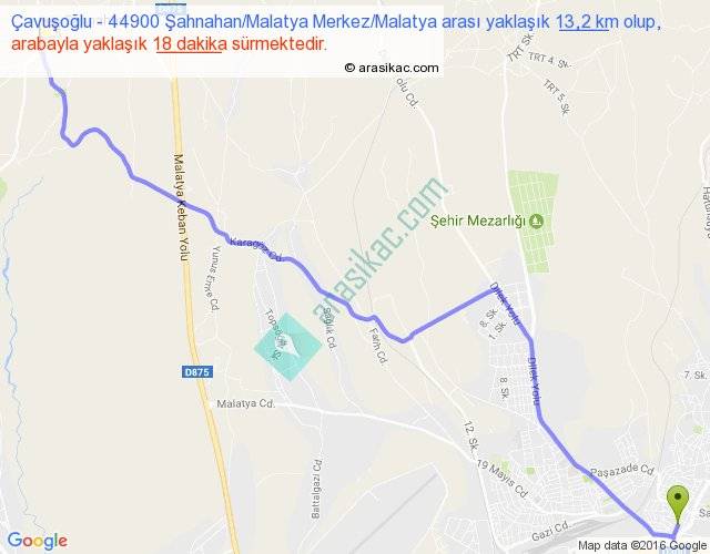 Çavuşoğlu - 44900 Şahnahan Malatya Merkez Malatya arası yaklaşık olarak 90 km/h ile yukarıda belirtilen sürede olup, iki yerin kuş uçuşu uzaklığı (mesafesi) 11'dir. Yolculuk otobüsle 23 dakika sürmektedir.