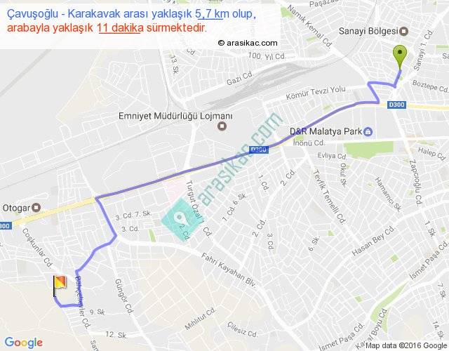 Çavuşoğlu - Karakavak arası yaklaşık olarak 90 km/h ile yukarıda belirtilen sürede olup, iki yerin kuş uçuşu uzaklığı (mesafesi) 4'dir. Yolculuk otobüsle 14 dakika sürmektedir.