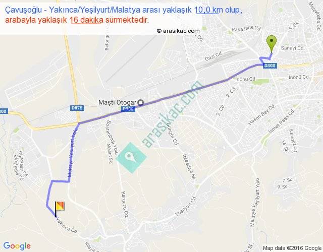 Çavuşoğlu - Yakınca Yeşilyurt Malatya arası yaklaşık olarak 90 km/h ile yukarıda belirtilen sürede olup, iki yerin kuş uçuşu uzaklığı (mesafesi) 8'dir. Yolculuk otobüsle 20 dakika sürmektedir.