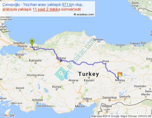 Çavuşoğlu - Yazıhan arası yaklaşık olarak 90 km/h ile yukarıda belirtilen sürede olup, iki yerin kuş uçuşu uzaklığı (mesafesi) 722'dir. Eğer belirtilen yerler arasında uçak seferi var ise bu süre uçakla 1 saat 06 dakika'ya kadar düşebilir. Yolculuk otobüsle 14 saat 20 dakika sürmektedir.