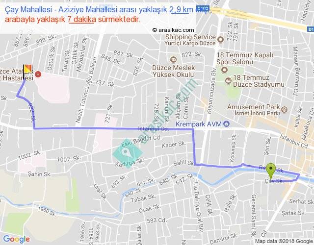 Çay Mahallesi - Aziziye Mahallesi arası yaklaşık olarak 90 km/h ile yukarıda belirtilen sürede olup, iki yerin kuş uçuşu uzaklığı (mesafesi) 2'dir. Yolculuk otobüsle 9 dakika sürmektedir.