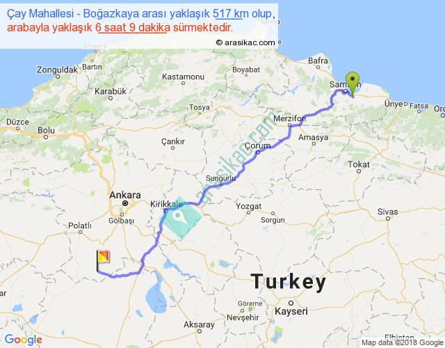 Çay Mahallesi - Boğazkaya arası yaklaşık olarak 90 km/h ile yukarıda belirtilen sürede olup, iki yerin kuş uçuşu uzaklığı (mesafesi) 412'dir. Eğer belirtilen yerler arasında uçak seferi var ise bu süre uçakla 38 dakika'ya kadar düşebilir. Yolculuk otobüsle 7 saat 59 dakika sürmektedir.