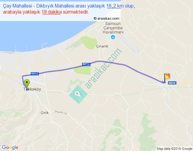 Çay Mahallesi - Dikbıyık Mahallesi arası yaklaşık olarak 90 km/h ile yukarıda belirtilen sürede olup, iki yerin kuş uçuşu uzaklığı (mesafesi) 13'dir. Yolculuk otobüsle 23 dakika sürmektedir.