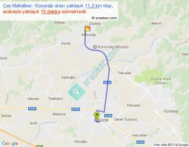 Çay Mahallesi - Konuralp arası yaklaşık olarak 90 km/h ile yukarıda belirtilen sürede olup, iki yerin kuş uçuşu uzaklığı (mesafesi) 9'dir. Yolculuk otobüsle 24 dakika sürmektedir.