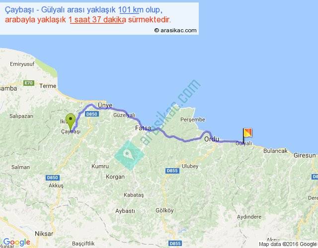 Çaybaşı - Gülyalı arası yaklaşık olarak 90 km/h ile yukarıda belirtilen sürede olup, iki yerin kuş uçuşu uzaklığı (mesafesi) 80'dir. Yolculuk otobüsle 2 saat 6 dakika sürmektedir.