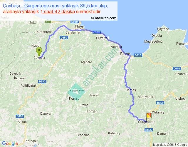 Çaybaşı - Gürgentepe arası yaklaşık olarak 90 km/h ile yukarıda belirtilen sürede olup, iki yerin kuş uçuşu uzaklığı (mesafesi) 49'dir. Yolculuk otobüsle 2 saat 12 dakika sürmektedir.