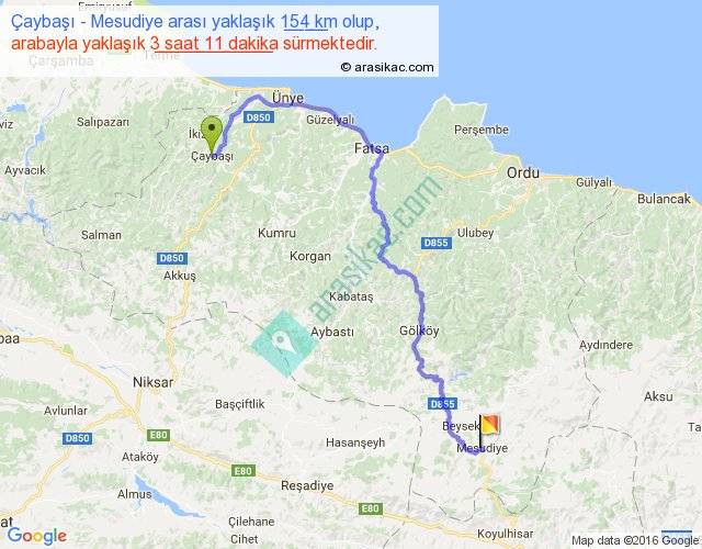 Çaybaşı - Mesudiye arası yaklaşık olarak 90 km/h ile yukarıda belirtilen sürede olup, iki yerin kuş uçuşu uzaklığı (mesafesi) 83'dir. Yolculuk otobüsle 4 saat 8 dakika sürmektedir.