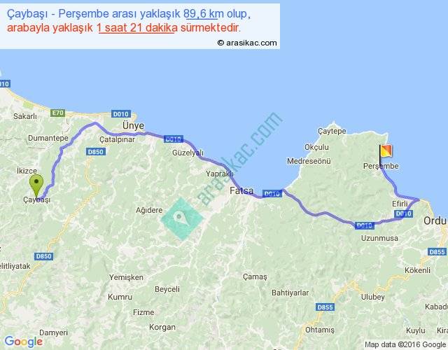 Çaybaşı - Perşembe arası yaklaşık olarak 90 km/h ile yukarıda belirtilen sürede olup, iki yerin kuş uçuşu uzaklığı (mesafesi) 57'dir. Yolculuk otobüsle 1 saat 45 dakika sürmektedir.