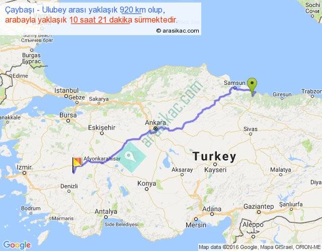 Çaybaşı - Ulubey arası yaklaşık olarak 90 km/h ile yukarıda belirtilen sürede olup, iki yerin kuş uçuşu uzaklığı (mesafesi) 723'dir. Eğer belirtilen yerler arasında uçak seferi var ise bu süre uçakla 1 saat 06 dakika'ya kadar düşebilir. Yolculuk otobüsle 13 saat 27 dakika sürmektedir.