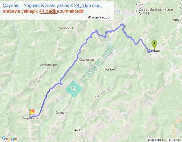 Çaybaşı - Yoğunoluk arası yaklaşık olarak 90 km/h ile yukarıda belirtilen sürede olup, iki yerin kuş uçuşu uzaklığı (mesafesi) 14'dir. Yolculuk otobüsle 57 dakika sürmektedir.