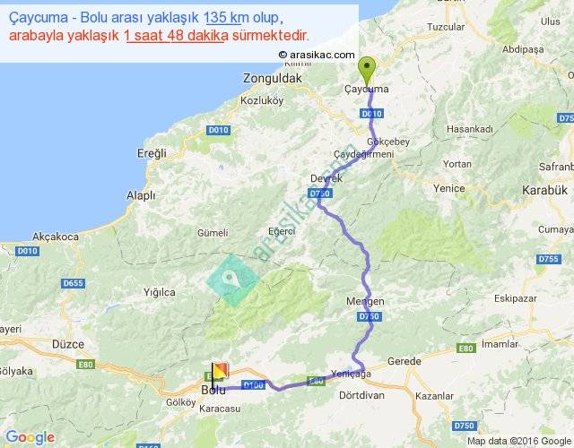 Çaycuma - Bolu arası yaklaşık olarak 90 km/h ile yukarıda belirtilen sürede olup, iki yerin kuş uçuşu uzaklığı (mesafesi) 86'dir. Yolculuk otobüsle 2 saat 20 dakika sürmektedir.
