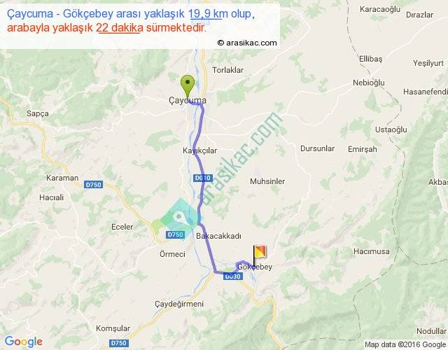 Çaycuma - Gökçebey arası yaklaşık olarak 90 km/h ile yukarıda belirtilen sürede olup, iki yerin kuş uçuşu uzaklığı (mesafesi) 15'dir. Yolculuk otobüsle 28 dakika sürmektedir.