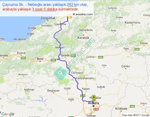 Çaycuma Sk. - Nebioğlu arası yaklaşık olarak 90 km/h ile yukarıda belirtilen sürede olup, iki yerin kuş uçuşu uzaklığı (mesafesi) 169'dir. Yolculuk otobüsle 3 saat 54 dakika sürmektedir.