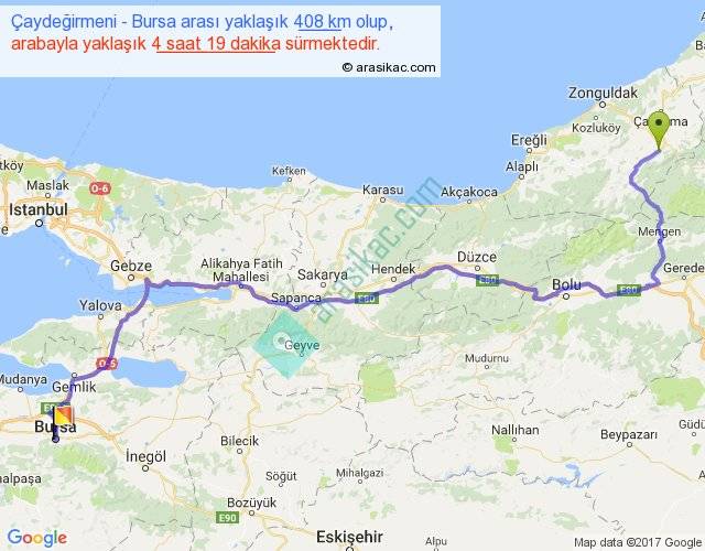 Çaydeğirmeni - Bursa arası yaklaşık olarak 90 km/h ile yukarıda belirtilen sürede olup, iki yerin kuş uçuşu uzaklığı (mesafesi) 279'dir. Eğer belirtilen yerler arasında uçak seferi var ise bu süre uçakla 25 dakika'ya kadar düşebilir. Yolculuk otobüsle 5 saat 36 dakika sürmektedir.