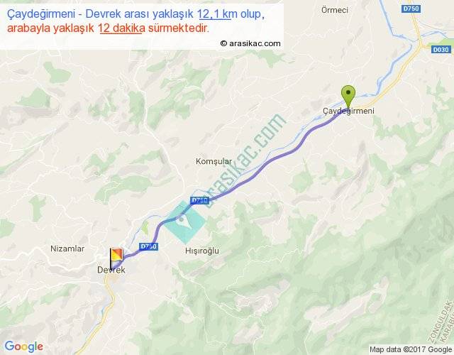 Çaydeğirmeni - Devrek arası yaklaşık olarak 90 km/h ile yukarıda belirtilen sürede olup, iki yerin kuş uçuşu uzaklığı (mesafesi) 11'dir. Yolculuk otobüsle 15 dakika sürmektedir.
