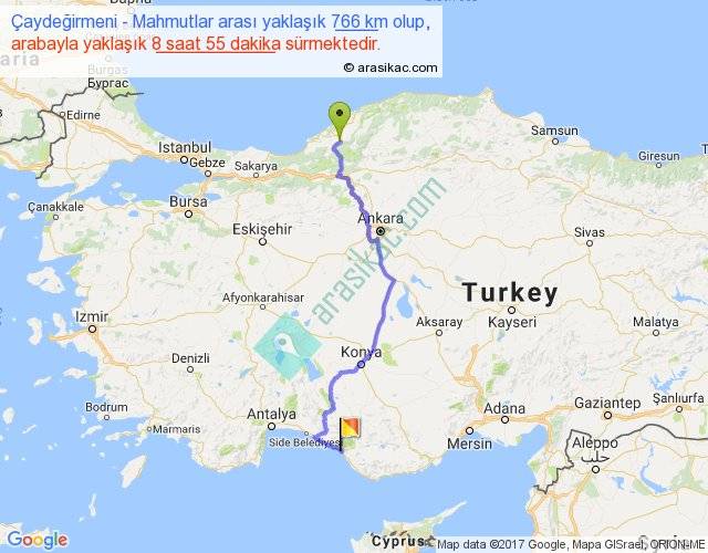 Çaydeğirmeni - Mahmutlar arası yaklaşık olarak 90 km/h ile yukarıda belirtilen sürede olup, iki yerin kuş uçuşu uzaklığı (mesafesi) 529'dir. Eğer belirtilen yerler arasında uçak seferi var ise bu süre uçakla 48 dakika'ya kadar düşebilir. Yolculuk otobüsle 11 saat 35 dakika sürmektedir.