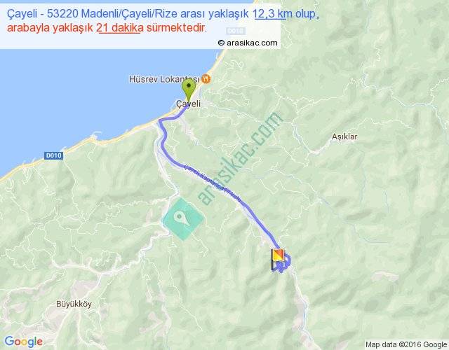 Çayeli - 53220 Madenli Çayeli Rize arası yaklaşık olarak 90 km/h ile yukarıda belirtilen sürede olup, iki yerin kuş uçuşu uzaklığı (mesafesi) 8'dir. Yolculuk otobüsle 27 dakika sürmektedir.