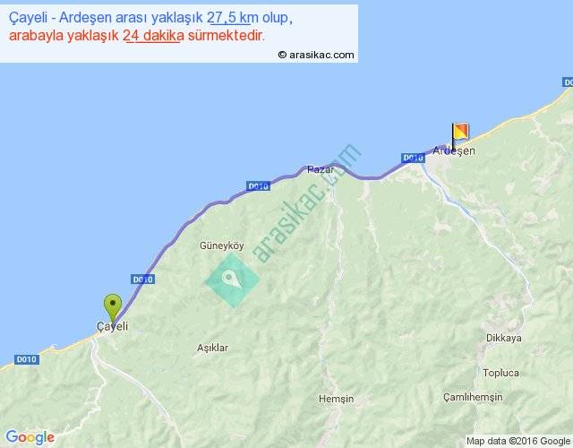 Çayeli - Ardeşen arası yaklaşık olarak 90 km/h ile yukarıda belirtilen sürede olup, iki yerin kuş uçuşu uzaklığı (mesafesi) 25'dir. Yolculuk otobüsle 31 dakika sürmektedir.