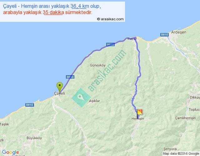Çayeli - Hemşin arası yaklaşık olarak 90 km/h ile yukarıda belirtilen sürede olup, iki yerin kuş uçuşu uzaklığı (mesafesi) 15'dir. Yolculuk otobüsle 45 dakika sürmektedir.