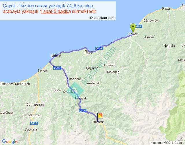 Çayeli - İkizdere arası yaklaşık olarak 90 km/h ile yukarıda belirtilen sürede olup, iki yerin kuş uçuşu uzaklığı (mesafesi) 37'dir. Yolculuk otobüsle 1 saat 24 dakika sürmektedir.