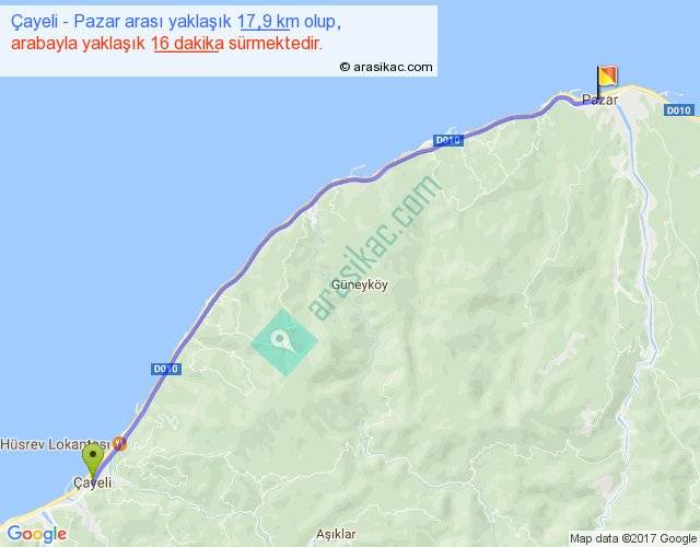 Çayeli - Pazar arası yaklaşık olarak 90 km/h ile yukarıda belirtilen sürede olup, iki yerin kuş uçuşu uzaklığı (mesafesi) 17'dir. Yolculuk otobüsle 20 dakika sürmektedir.