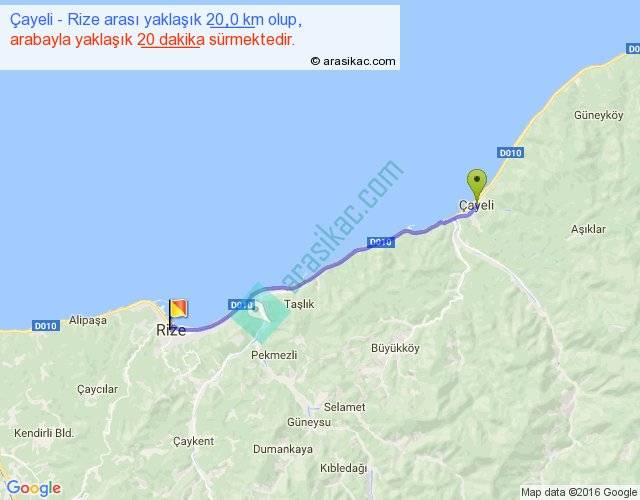 Çayeli - Rize arası yaklaşık olarak 90 km/h ile yukarıda belirtilen sürede olup, iki yerin kuş uçuşu uzaklığı (mesafesi) 19'dir. Yolculuk otobüsle 26 dakika sürmektedir.