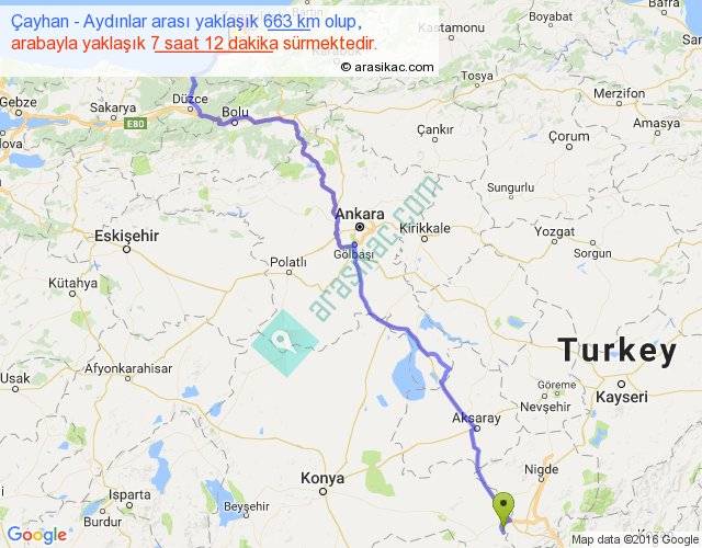 Çayhan - Aydınlar arası yaklaşık olarak 90 km/h ile yukarıda belirtilen sürede olup, iki yerin kuş uçuşu uzaklığı (mesafesi) 473'dir. Eğer belirtilen yerler arasında uçak seferi var ise bu süre uçakla 43 dakika'ya kadar düşebilir. Yolculuk otobüsle 9 saat 21 dakika sürmektedir.