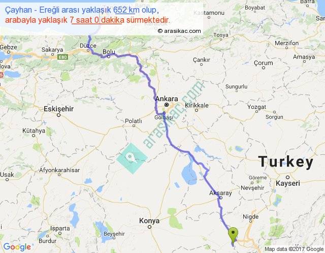 Çayhan - Ereğli arası yaklaşık olarak 90 km/h ile yukarıda belirtilen sürede olup, iki yerin kuş uçuşu uzaklığı (mesafesi) 480'dir. Eğer belirtilen yerler arasında uçak seferi var ise bu süre uçakla 44 dakika'ya kadar düşebilir. Yolculuk otobüsle 9 saat 6 dakika sürmektedir.