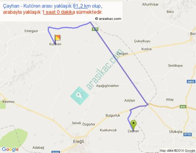 Çayhan - Kutören arası yaklaşık olarak 90 km/h ile yukarıda belirtilen sürede olup, iki yerin kuş uçuşu uzaklığı (mesafesi) 46'dir. Yolculuk otobüsle 1 saat 18 dakika sürmektedir.