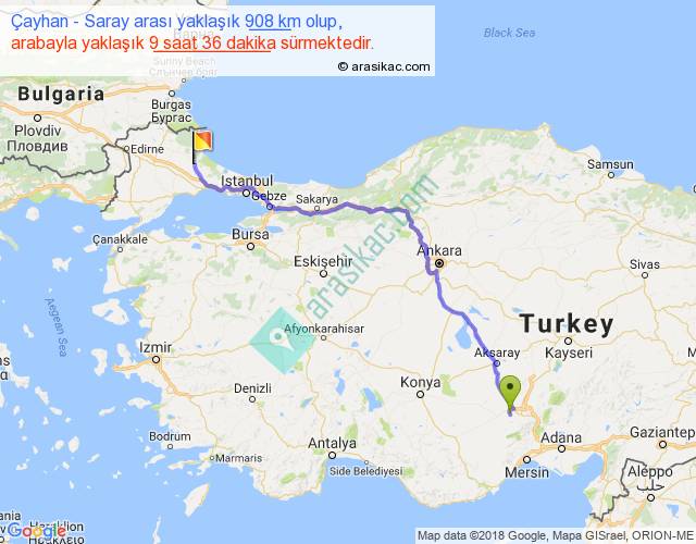Çayhan - Saray arası yaklaşık olarak 90 km/h ile yukarıda belirtilen sürede olup, iki yerin kuş uçuşu uzaklığı (mesafesi) 693'dir. Eğer belirtilen yerler arasında uçak seferi var ise bu süre uçakla 1 saat 03 dakika'ya kadar düşebilir. Yolculuk otobüsle 12 saat 28 dakika sürmektedir.