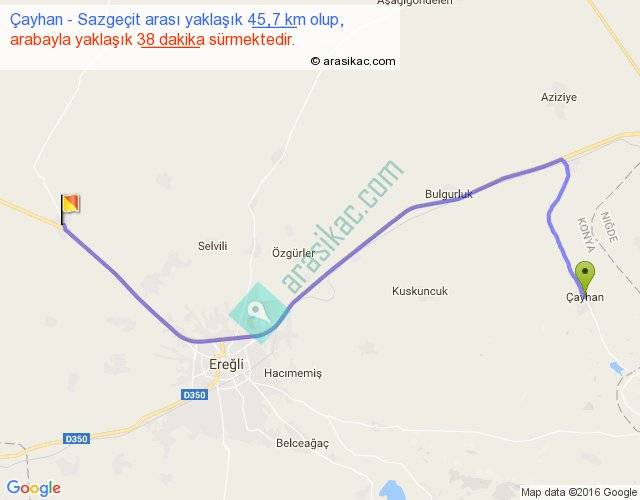 Çayhan - Sazgeçit arası yaklaşık olarak 90 km/h ile yukarıda belirtilen sürede olup, iki yerin kuş uçuşu uzaklığı (mesafesi) 32'dir. Yolculuk otobüsle 49 dakika sürmektedir.