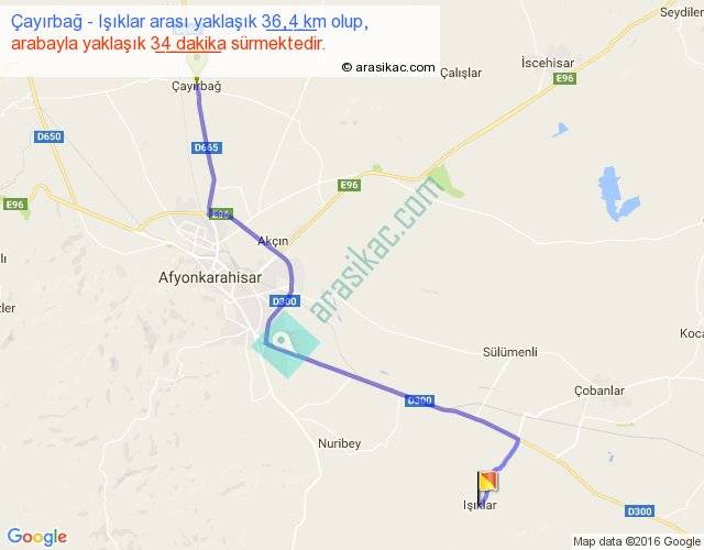 Çayırbağ - Işıklar arası yaklaşık olarak 90 km/h ile yukarıda belirtilen sürede olup, iki yerin kuş uçuşu uzaklığı (mesafesi) 27'dir. Yolculuk otobüsle 44 dakika sürmektedir.