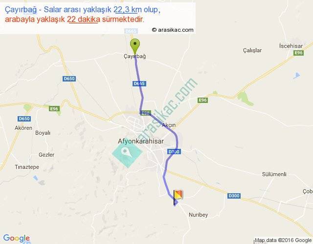 Çayırbağ - Salar arası yaklaşık olarak 90 km/h ile yukarıda belirtilen sürede olup, iki yerin kuş uçuşu uzaklığı (mesafesi) 19'dir. Yolculuk otobüsle 28 dakika sürmektedir.