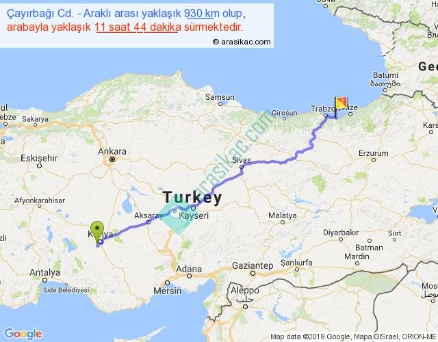 Çayırbağı Cd. - Araklı arası yaklaşık olarak 90 km/h ile yukarıda belirtilen sürede olup, iki yerin kuş uçuşu uzaklığı (mesafesi) 744'dir. Eğer belirtilen yerler arasında uçak seferi var ise bu süre uçakla 1 saat 08 dakika'ya kadar düşebilir. Yolculuk otobüsle 15 saat 15 dakika sürmektedir.