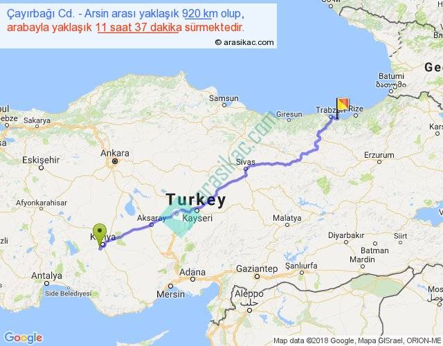 Çayırbağı Cd. - Arsin arası yaklaşık olarak 90 km/h ile yukarıda belirtilen sürede olup, iki yerin kuş uçuşu uzaklığı (mesafesi) 736'dir. Eğer belirtilen yerler arasında uçak seferi var ise bu süre uçakla 1 saat 07 dakika'ya kadar düşebilir. Yolculuk otobüsle 15 saat 6 dakika sürmektedir.