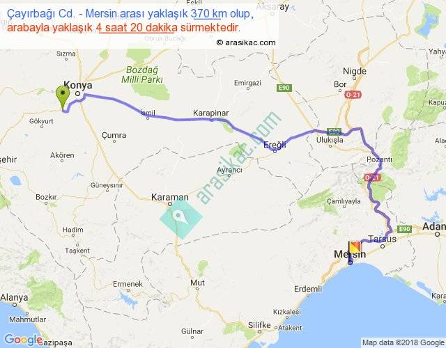 Çayırbağı Cd. - Mersin arası yaklaşık olarak 90 km/h ile yukarıda belirtilen sürede olup, iki yerin kuş uçuşu uzaklığı (mesafesi) 225'dir. Yolculuk otobüsle 5 saat 38 dakika sürmektedir.