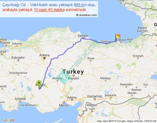 Çayırbağı Cd. - Vakfıkebir arası yaklaşık olarak 90 km/h ile yukarıda belirtilen sürede olup, iki yerin kuş uçuşu uzaklığı (mesafesi) 692'dir. Eğer belirtilen yerler arasında uçak seferi var ise bu süre uçakla 1 saat 03 dakika'ya kadar düşebilir. Yolculuk otobüsle 13 saat 52 dakika sürmektedir.